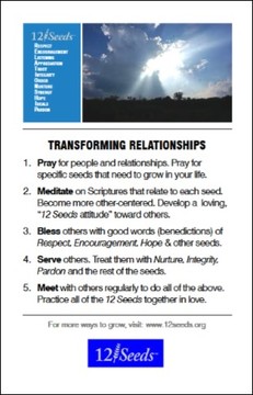 The 12 Seeds are Biblical principles for excellent relationships. But how do we apply them to our lives? Transforming Relationships half-sheet reminder lists 5 life-changing habits that help grow the 12 Seeds. This comes 2-up on 8.5″ x 11″ paper. It can be used as a bulletin insert, study sheet or bookmark.